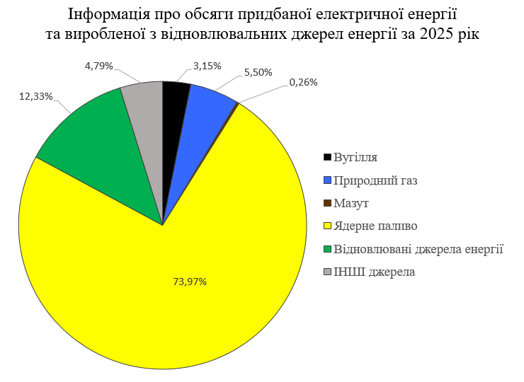 Інформація щодо частки кожного джерела енергії, яка була використана у загальній структурі балансу купленої та/або виробленої електричної енергії на власних електроустановках та вплив на навколишнє середовище, спричинений таким виробництвом електроенергії (питомі показники викидів CO2 та радіоактивне забруднення), за 2025 рік.